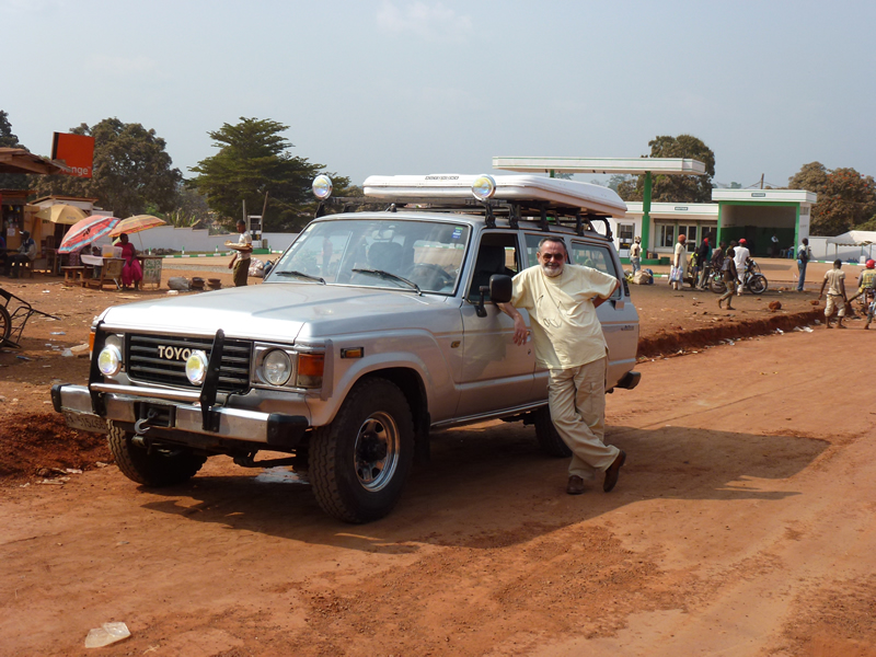 Corpi che si muovono freneticamente, collisioni non sempre evitate, lotte per un posto in prima fila al nastro trasportatore, grandi valigie, carrelli introvabili, colori, odori, neonati a tracolla, caos e caldo umido. Infine un signore in caftano azzurro e tessuto bianco arrotolato attorno alla testa ci sottrae ad un paio di ragazzi che non ci mollano, si chiama Ermin e ci stava aspettando, siamo arrivati in Africa. Dopo tre anni avevamo dimenticato Douala, ma non il rosa dei gamberoni di Delphine e per contrasto il bianco ed il nero mescolati sulle poltroncine del bar dell’hotel Ibis dove sorrisi forzatamente allegri color rosso acceso aspettano di essere noleggiati per un bacio ed altro. E’ di nuovo mattina quando un altro signore, alto e nerissimo ci accompagna da Gazelle, si chiama Francois ed anche lui ci stava aspettando per mostrarci il capolavoro del quale va fiero… rimessa a nuovo ed ancora parcheggiata nel cortile dove l’avevamo lasciata troviamo la nostra compagna di viaggi diversa. Accessoriata con fanali supplementari e verricello, il nuovo look non le si addice ma la fa sembrare un fuoristrada serio, un inaspettato colpo di scena che ci consentirà di uscire da eventuali inpantanamenti, di viaggiare al fresco e con colonna sonora, il regista invisibile di tutto ciò è un caro amico, generoso ed onnipotente.
