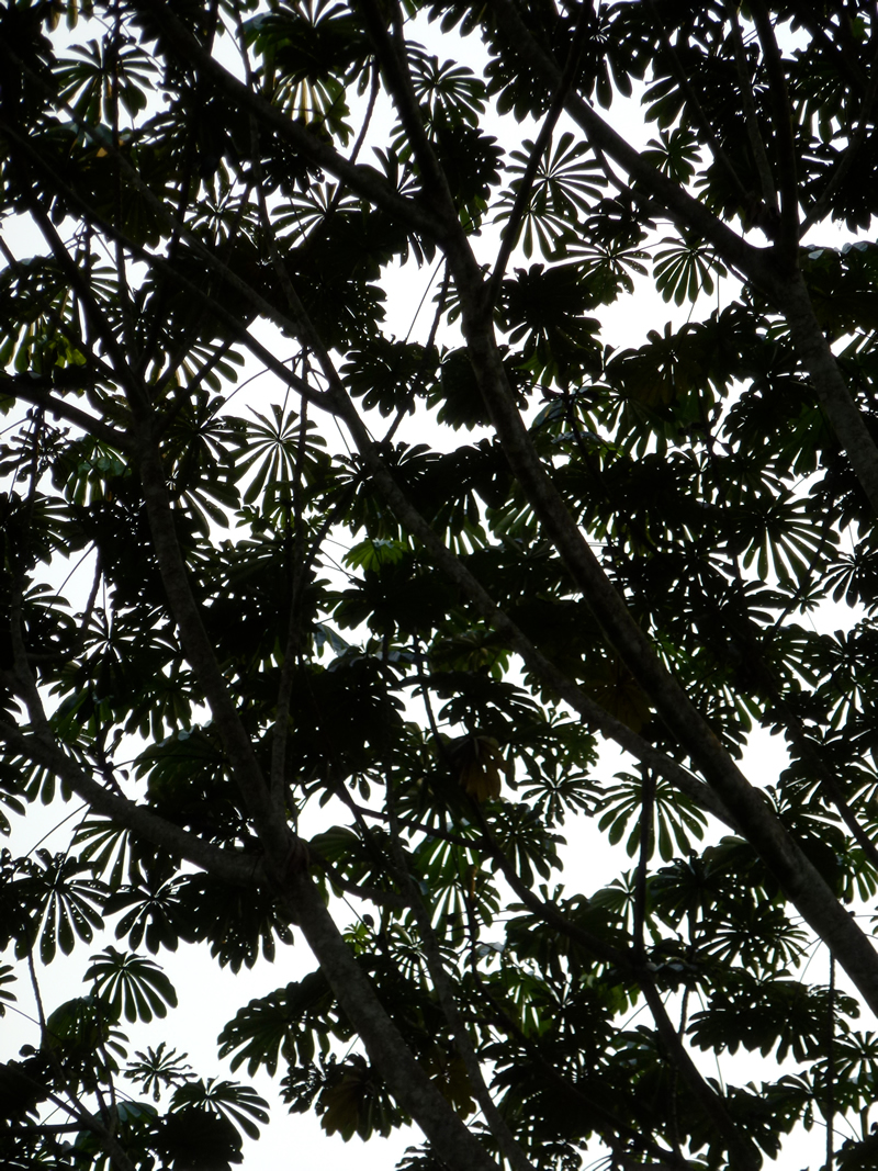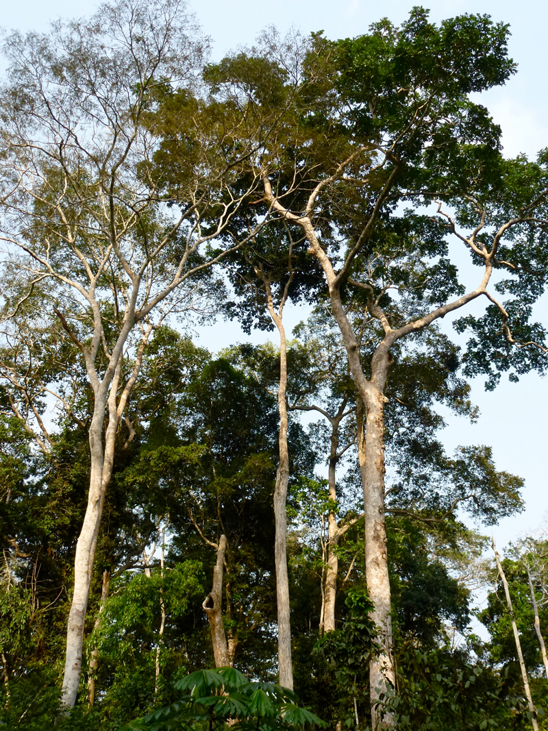 Consigliatissimo dai simpatici francesi del campo ci avviamo di buonora carichi di aspettative lungo la strada che porta al Parco Djembé, come sempre sterrata e rossa. Con due taniche di benzina nel cassone, il frigorifero da viaggio pieno di bevande e di cibo, facendoci largo a colpi di machete sui rami che bloccano la strada ci inoltriamo nel grande parco del WWF. La luce del sole ancora bassa, avanziamo con qualche sussulto circondati dal concentrato di foglie e legno nel quale cercando gorilla troviamo invece una elefantessa di foresta ed il suo bebè che attraversano la strada …. un avvistamento che molti avrebbero considerato fortunato dato che la foresta rende questi elefanti soprattutto invisibili …. ma siamo esigenti e considerando questo solo un assaggino di ciò che verrà proseguiamo con l’entusiasmo di chi è stato sempre molto fortunato… in altri parchi africani. Accompagnati da scimmie che saltano da un ramo all’altro in perfetti equilibrismi e dai suoni che rendono la foresta ancora più misteriosa arriviamo al campo di accoglienza dopo più di tre ore di comodo viaggio da Kika. L’immenso Congo è ora ad un centinaio di metri da noi, oltre il fiume limaccioso dove piroghe di legno sono legate ad un paletto di legno e qualche tegame già lavato è in equilibrio su una rudimentale panca affondata nella melma cedevole della riva. Accolti da un gruppetto assortito di giovani bantù e di pigmei, solo ora in pacifica convivenza ma fino a qualche decennio fa rispettivamente cacciatori e prede, siamo subito informati dell’inconveniente …. il responsabile del parco è andato in ferie portando con sé le chiavi dei luoghi strategici, anche quelle dei bungalow a palafitta con zanzariera che si affaccia ad angolo sul fiume dove avrei tanto voluto dormire. Ma non è finita qui, il diffidente direttore ci ha resa impossibile anche la balade sul fiume ed inutilizzabili le due taniche di benzina che Bruno ci aveva consigliato per questo di portare … i ragazzi però ci propongono subito qualche alternativa, anche per non perdere gli incassi che l’arrivo di due turisti garantiscono loro …. ed a giudicare dal bel sorriso col quale afferrano le provviste che abbiamo portato in omaggio il boss deve aver chiuso a chiave anche la dispensa. Per incoraggiarci a rimanere preparano in fretta la nostra camera dentro uno spartano basso casolare, il pavimento di cemento, una lampadina penzolante dal soffitto ed una piccola finestra…. l’estrema pulizia di lenzuola ed asciugamani sono una bella sorpresa dopo aver visto le loro magliette….. non resta che incamminarci lungo il sentiero che si inoltra tra gli alberi altissimi, dando inizio alla nostra passeggiata esplorativa. Vanni fa il suo ingresso in foresta con gli inseparabili mocassini, un alibi che gli ha sempre consentito di evitare la fatica di lunghe passeggiate in situazioni non comode, questa volta però vince la curiosità e l’improvviso inaspettato desiderio di avventura. E’ così che armato di machete segue il pigmeo che apre il passaggio mentre dietro di noi un bantu in uniforme verde dall’espressione incazzata impugna un fucile primitivo, la canna piegata sul calcio di legno smangiucchiato dalle termiti e sul palmo della mano due cartucce forse usate…. è qui per difenderci dall’assalto di animali pericolosi…. ma quali animali? E’ evidente anche a noi che quando si cammina in quattro sulle foglie secche di animali selvaggi se ne vedono pochi … e che quello che i due ci propongono è un evidente show. Ma gli stop improvvisi ed i brevi ingressi nel fitto della vegetazione ci divertono e ci calano nel ruolo che anche noi ora vogliamo recitare, quello degli esploratori bianchi preceduti e seguiti da uomini neri che in questo caso non trasportano bauli sulle loro spalle… fra radici, semi giganteschi, frutti caduti a terra, qualche scimmia che non resiste curiosa dal rendersi visibile e le cacche degli animali che non vedremo. Rapiti da questo paese delle meraviglie proseguiamo tra i tronchi altissimi e le loro basi massicce, le liane e le foglie sempre diverse, le chiome abbondanti ed i rami secchi, i muschi ed il caos di questo infinito repertorio naturale tante volte immaginato che oggi si è complicato di suoni e profumi.