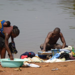 La foresta è oltre il fiume limaccioso, appena visibile dal belvedere costruito sul punto più esterno del campo. Completamente invisibile invece, oltre il cancello sorvegliato c’è il villaggio dove i locali vivono in povere baracche di legno ed i bambini si muovono vivaci con i loro ventri gonfi ed i sorrisi sulle labbra. Qualche adulto con la bottiglia di birra in mano mi invita ad entrare nelle case dove vivono quei bambini, i loro figli, desiderando pateticamente scaricare su di me la responsabilità della loro povertà, come se ciò non dipendesse dalla loro scarsa intraprendenza e dalla radicata avversione al lavoro. Quelli che non stanno ciondolando sulle panche di fronte ai baretti che vendono birra lavorano nell’azienda locale, alle macchine che trasformano gli alberi in assi e listelli o che marchiano con triangoli e cerchi colorati le sezioni dei tronchi abbattuti e tagliati. Due realtà opposte, i bianchi ed i neri, i lavoratori e gli oziosi, i ricchi ed i poveri che trovano un punto di comunione, il luogo di pacifica convivenza nella fabbrica del legno. Chassy è il cuoco del club, introvabile quando se ne ha bisogno ma zelante quando infine dopo averlo individuato gli si chiede di preparare una colazione o un’insalata. Le sue emicranie, la troppa birra e la sorella all’ospedale della parrocchia ne fanno un bersaglio mobile che solo i custodi fermi al cancello riescono a rintracciare e qualche volta a convincere di spostarsi dal villaggio al club. E’ con lui che mi avvio lungo lo stradello che scende ripido oltre lo steccato del campo fino al fiume abbastanza largo da divaricare la foresta che lo comprime sulle sponde. La spiaggetta è affollata. Donne armate di sapone lavano sbattendo più volte i vestiti sull’acqua, forse quelli dei bambini che giocano nudi sulla riva e poi tuffano i loro corpi perfetti e vellutati dentro la superficie marroncina. Una bambina alta poche decine di centimetri piange per la gomitata che sua madre le ha assestato sulla testa e poco dopo il barcaiolo poliomielitico che arriva a bordo della sua piroga scavata nel legno di un albero. Le gambe sono quasi invisibili sotto il busto, nascoste sotto l’assicella sulla quale è seduto, rattrappite sul fondo. Scivoliamo nel silenzio delle acque immobili, accompagnati dalla leggera brezza generata dal nostro movimento, lentamente all’ombra degli alberi inclinati verso l’acqua, vorremmo non fermarci per ore, continuando a lanciare cenni di saluto ai pescatori che seduti sulle loro piroghe posano per una foto mentre trattengono le lenze con le dita dei piedi o lanciano reti leggere sulla superficie che si increspa. Il ritorno controcorrente è scandito da incontri che vogliono sembrare casuali, si è sparsa la voce del mio passaggio ed alcuni non resistono alla tentazione di agganciarmi per una foto in bianca e nero o per la sponsorizzazione di un’agenzia di turismo… l’attività più improbabile qui a Mindourou. Poi è il turno del piroghiere che ripulito e seduto sulla sua rudimentale sedia a rotelle arriva al cancello del campo chiedendomi un compenso esorbitante al quale cedo volentieri.