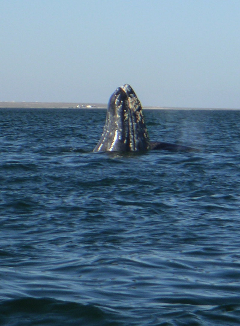 Partiamo di buonora verso Guerriero Negro che a 150 km da noi ci aspetta con le sue numerose balene grigie provenienti dall’Alaska. Appena usciti sul lungomare vediamo il bellissimo paesaggio desertico nel quale siamo immersi, cui fa da sfondo il mare blu intenso. Visto e subito lasciato questo bel mare; ci dirigiamo infatti verso l’interno per raggiungere la costa pacifica, attraversando territori inospitali pieni di cactus di ogni dimensione e specie. Avvistiamo anche il vulcano delle tre vergini che si staglia imponente all’uscita di un’ampia curva. La strada sinuosa si arrampica lungo i pendii di questa arida sierra non particolarmente alta, ad ogni sterzata di Carolina i colori sempre variabili del terreno si stemperano in sfumature accattivanti sopra la totemica vegetazione. La sierra lascia il posto alla pianura ancora caratterizzata dalla stessa spinosa vegetazione. Le curve lasciano il posto a rettilinei affollati di lunghe carovane di sporchi americani in fila con i loro camper e pullman monocromi. Più oltre ecco il pueblo di Guerrero Negro immerso nell’ampia laguna che lo circonda, la famosa Ojo de Lieve ( occhio di lepre) dove le balene arrivano numerose per riprodursi. Giungiamo al pueblo non sapendo nulla….per esempio quale sia il punto da cui partono le lance di avvistamento, decidiamo di seguire i cartelli che ci suggeriscono mete allettanti come “le dune” o “il vecchio faro” o “avistamento de aves “. La larga strada bianca che come un lungo ponte si insinua dentro la laguna, termina con uno slargo a ridosso del mare aperto. Non siamo soli qui, ad ammirare la lingua di dune che si sviluppa a perdita d’occhio parallela alla costa. Come una barriera naturale a protezione della laguna, le alte dune sono proprio del colore che preferisco, una vasta gamma di sfumature ocra. La cosa particolare è che sono li isolate dentro al mare, a 200 metri da noi, come se potesse esistere una fascia di deserto circondato dall’acqua. Siamo incantati di fronte alla magia di questo strano fenomeno naturale…e come noi altre auto dai cui sportelli aperti si spandono nell’aria le note di chiassose canzoni messicane, stanno immobili ad aspettare. E’ domenica oggi ed alcune famiglie locali sono qui a pescare sulle piattaforme circolari che avanzano sul mare, o per un pic nic . Fanno un gran casino, bambini e non….sono vivaci questi messicani! Tornati sui nostri passi e sondate le varie stradine dentro la laguna andiamo questa volta nella direzione degli avvistamenti. Per fortuna qui, a differenza della penisola Valdez in Argentina, le piccole lance partono frequenti ad ogni orario anche pomeridiano. La lancia delle 4 ci porta al centro del grande specchio d’acqua dell’ojo de lieve, le balene sono numerosissime. Il ragazzo che ci guida dice che ce ne sono 750, ma che l’anno scorso, nel periodo di grande afflusso ne sono state contate 2000. Incredibile! Queste balene grigie del pacifico sono vivaci…amano emergere dall’acqua con tutta la loro parte anteriore…come a cercare il calore del sole…o qualcosa da vedere che non siano le profondità marine. Alcune si avvicinano sfiorando la barca, altre guizzano verso l’alto con agilità . Certo ci danno una gran soddisfazione! Torniamo verso la strada asfaltata quando il sole è già al tramonto ( posada del sol ) , vediamo le immense saline bianche tingersi di rosa…la bellezza è indicibile. Dormiamo alla “Cabanas Don Miguelito”, all’interno del complesso Malarrimo. Praticamente un grande recinto circondato da un alto muro che si profila in tutta la sua estensione all’interno di questo territorio semidesertico fatto di poco o nulla.. Mangio degli ottimi callo de mano de leon (capesante) alla mantequilla ( burro )…davvero squisite!