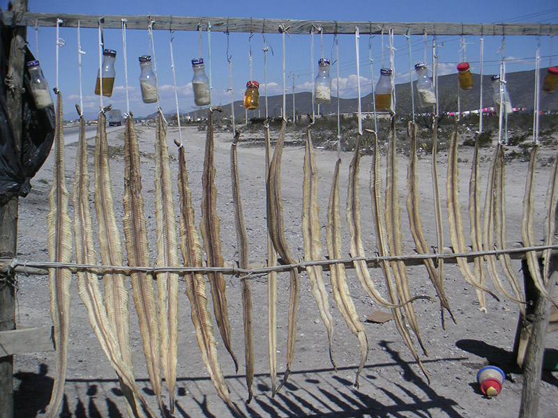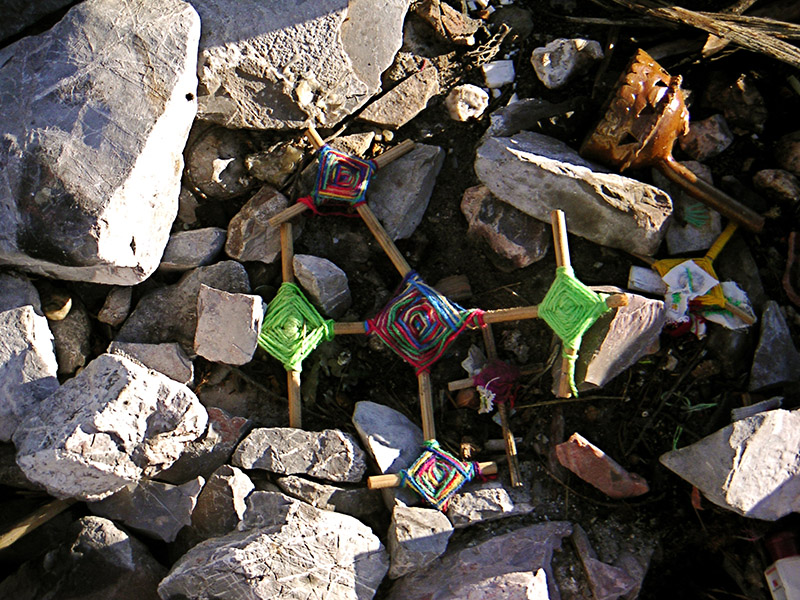 Nel frattempo, dopo una breve sosta lungo la strada per la curiosità di osservare da vicino quel che resta dei serpenti a sonagli messi ad essiccare penzoloni su bastoni di legno, arriviamo a Real de Catorce, sperduta al limitare del deserto ed appollaiata a 2750 m di altitudine. Questa cittadina quasi completamente diroccata è stata dimenticata dagli uomini e da dio per un secolo. E’ proprio una città fantasma, nascosta nel fondo di una valle, in mezzo ad un paesaggio lunare dominato dalla bianca cupola della cattedrale. Arriviamo qui percorrendo una strada lastricata che si arrampica sulle montagne brulle e che si insinua ad un certo punto dentro un lungo tunnel scavato nella roccia. Sembra di entrare in una miniera e invece dopo circa un paio di chilometri sbuchiamo tra le case del paese, quasi tutte in pietra a vista, molte delle quali diroccate. Guardo sulla cartina della guida la posizione dell’hotel “Ruinas del Real” ed iniziamo a percorrere le ripide stradine dai lastricati sconnessi. Gli ultimi tratti di strada sono ripidissimi e devo scendere ad inserire le quattro ruote motrici, l’aria è fresca ed asciutta, le montagne attorno a noi brulle e colorate dei tanti minerali che le compongono. L’hotel occupa un vecchio edificio di sasso, entriamo e dopo un po’ di contrattazioni riusciamo ad avere la suite con jacuzzi gigante a 800 pesos al giorno anziché 1200. Un vero affare! La camera, come tutto l’hotel emana un incredibile atmosfera di vissuto, di storia e di pacata raffinatezza. Vi si accede attraverso un’ampia terrazza coperta da una sorta di incannicciato che ne lascia intravedere il cielo e passare i raggi del sole che ne intiepidiscono l’aria. In fondo alla terrazza dalla quale si domina la valle e le montagne circostanti, una piccola porta di legno da accesso ad un salotto comune con finestra ovale e camino d’angolo. Di poco laterale la porta della nostra camera ci invita ad entrare. Sopra il grande lettone un quadro antico ed accostati alle pareti pochi elementi di arredo fabbricati in uno stile incomprensibile ma elegante con laccatura di un colore perlaceo. La stanza da bagno è molto grande, con doccia ed una grande vasca idromassaggio inserita in un alto gradino piastrellato. Una finastra ovale dai vetri colorati lascia passare una luce fioca che esalta il colore viola delle pareti. Quelle della camera invece, e del salotto hanno come colore dominante il giallo ocra, con disegni a cornice dipinti sopra lo zoccolo o a bordare le finestre. Sono disegni di fiori e foglie che si articolano in ampie volute vagamente liberty. Ci piace proprio tanto questa stanza!…..se poi avesse il camino in camera sarebbe il massimo! Non si capisce come facciano qui in Messico a non avere il riscaldamento nemmeno negli hotel. Le sere d’inverno qui la temperatura scende anche sotto i dieci gradi , eppure il riscaldamento non è neppure concepito! Per noi due freddolosi è un vero disagio. Ma Vanni ha un asso nella manica, anzi nel trolley, da giocare. Estrae la mitica borsa dell’acqua calda che ci ripromettiamo di usare questa sera. Nel frattempo Rifugio, un ragazzo del paese, ci aiuta con i bagagli e si propone di accompagnarci in una passeggiata a cavallo al monte sacro degli Huichole. Come rifiutare? Arriva dopo una mezz’ora, verso le 4, con due ronzini. Il mio si chiama Marrano e quello di Vanni, di stazza più grande, è Bucanero. Saliamo in sella…io con un certo timore….il trauma di anni fa non mi è ancora passato del tutto…e non salgo su un cavallo da più di 15 anni. Sono tutta agitata ma mi rendo subito conto che Marrano è un cavallo tranquillo del quale posso fidarmi. Rifugio ci segue in groppa ad un mulo. La prima sosta è direi imposta dai due cavalli che si fermano all’abbeveratoio del paese dove altri due cavalli, che trasportano dei signori del paese, stanno bevendo. Si riparte immediatamente dopo attraverso le rovine degli edifici della ex miniera di San Augustin, Marrano procede sempre sull’orlo del precipizio…ahimè! Il lungo sentiero si snoda attraverso i pendii delle montagne che dal paese vanno verso il deserto inseguendo l’ Ovest. Il paesaggio è incantevole, le montagne piene delle piante grasse tipiche di questi climi. Siamo sul tropico del Cancro. Il freddo è pungente, per fortuna indosso il mio poncho di lana bianca comprato in Guatemala, sembra di essere immersi in un presepio all’interno del quale noi siamo i tre re magi. Si respira una grande energia qui…l’aria è secca ed il paesaggio apocalittico. Rifugio ci racconta che prima dello sfruttamento delle miniere d’argento queste montagne erano completamente ricoperte di alberi. Gli spagnoli non esitarono a disboscarle completamente per poter fondere il metallo dalla roccia che lo conteneva…nessuna novità…queste parole ci suonano purtroppo familiari dopo mesi di viaggio attraverso le ex colonie spagnole. In lontananza scorgiamo la montagna sacra, la più alta della regione, che svetta a 3300 m di quota. Gli huicholes la raggiungono due volte l’anno, attraversando a piedi le centinaia di chilometri di deserto che separano i loro territori sul Pacifico da questa valle sacra. Qui, all’interno di un cerchio bordato di pietre, celebrano uno dei loro riti secolari, la comunione con il dio Hikuri, a noi noto come peyote, il fungo allucinogeno. Quello che accade durante le loro cerimonie è prevedibile….ma oltre lo sballo inevitabile o proprio grazie ad esso, gli sciamani qui celebrano le nozze e guariscono gli ammalati. Raggiungo a piedi la piccola chiesa che sorge proprio in cima alla montagna, è di sassi e protetta da un cancello di ferro che mi impedisce di entrare. All’interno, accostate sul muro di fondo, una serie di candele di varie dimensioni con nastri di tessuto colorato, a terra alcune ciotole per le offerte agli dei e su una mensola il teschio di un capretto ed il suo peloso codino. Il pavimento di terra battuta contiene le tracce dei lo